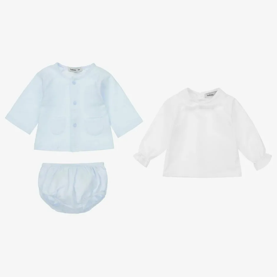 Pale blue and white shorts set for little boys and girls by Babidu. The blue shorts and cardigan are made in soft cotton jersey, with a fine honeycomb texture and there are pockets on the cardigan. The white shirt is made in lightweight cotton with elasticated cuffs and a rounded collar.