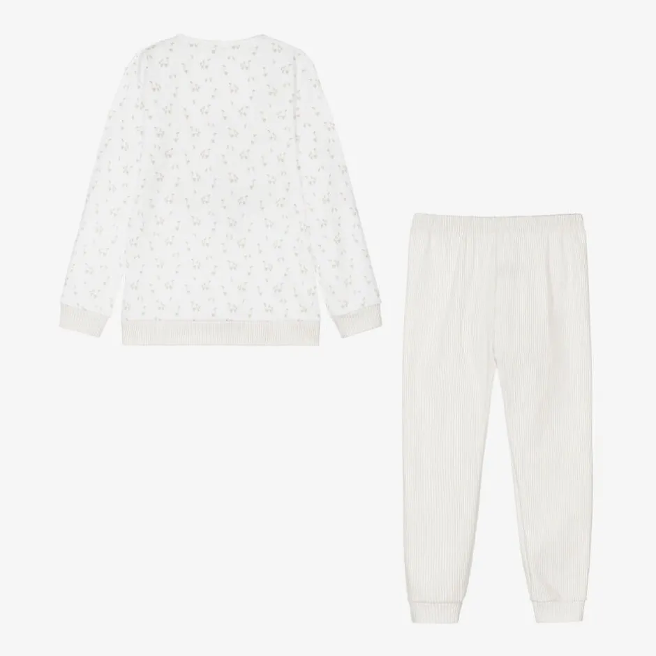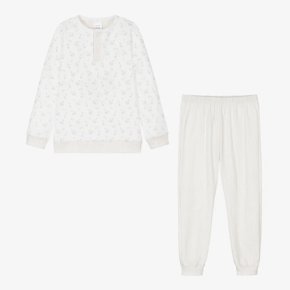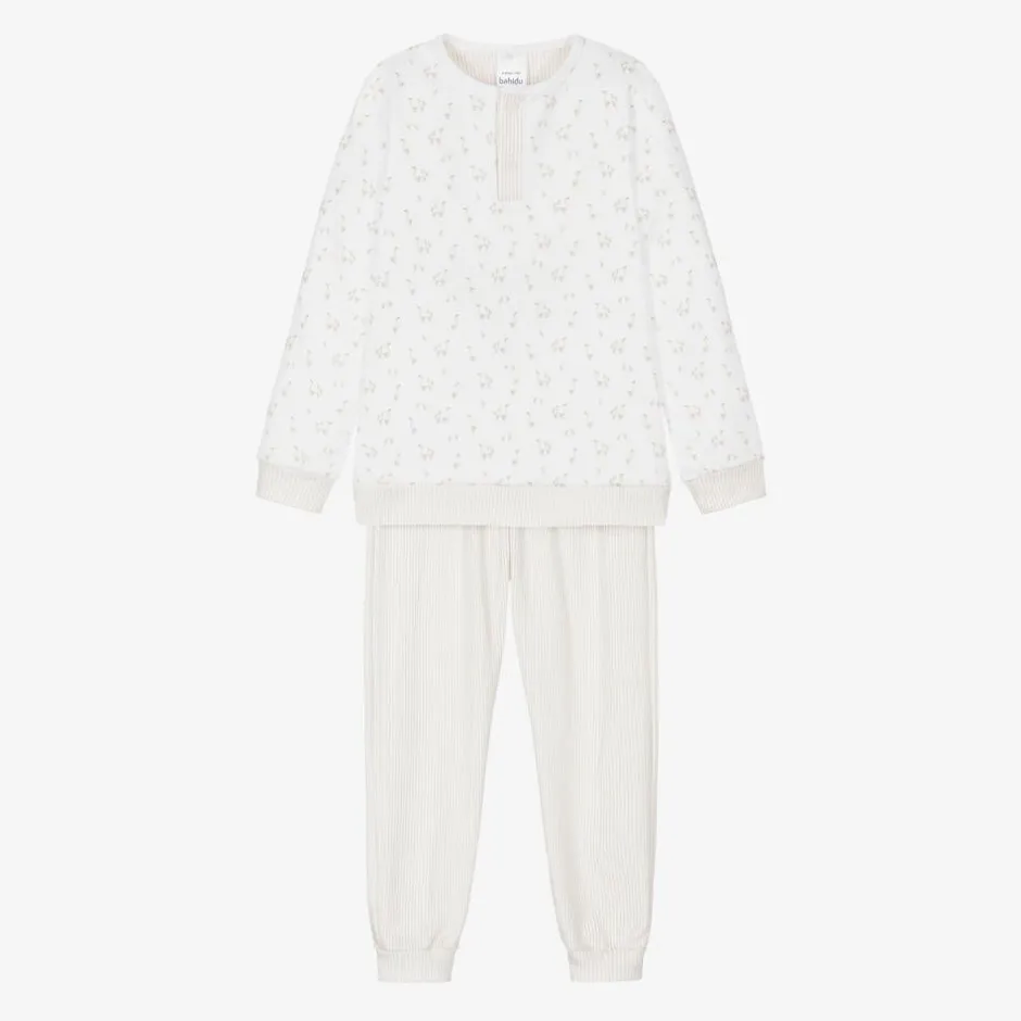White and light beige pyjamas for boys by Babidu, made in soft cotton jersey for all-night comfort. Ideal for cooler temperatures, the long-sleeved top has an adorable duck print with contrasting trims on the cuffs and hem. A two-button placket fastens below the neckline. The striped, full-length bottoms have an elasticated waist and cuffed ankles.