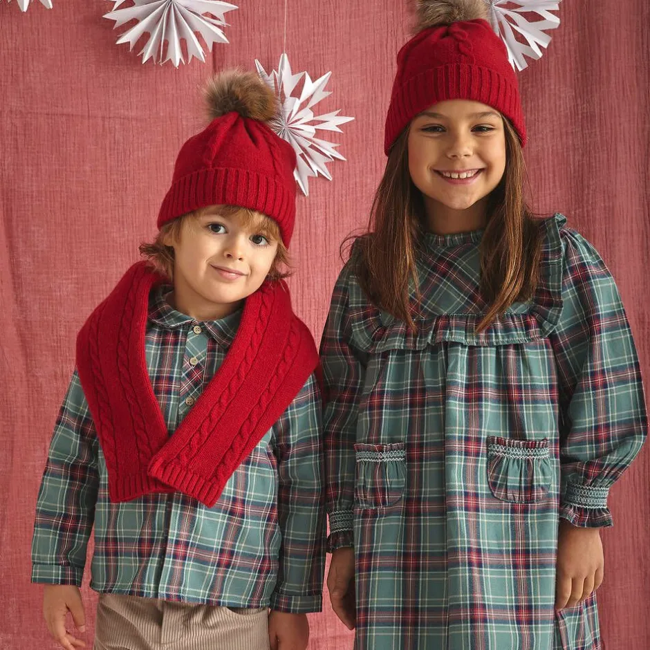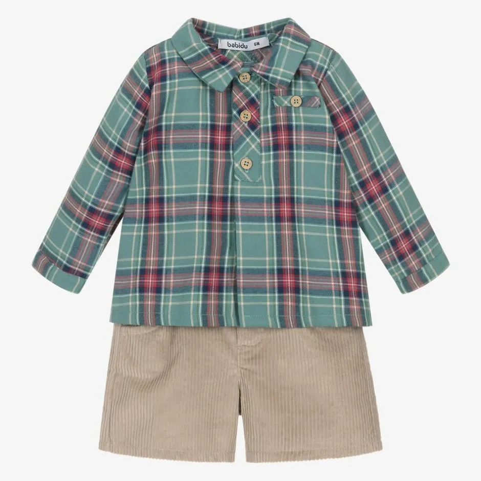 A green and beige cotton shorts set for little boys by Babidu. With faux wooden button fastenings on the front half-placket, the green and red tartan shirt is made in soft, lightweight twill. The corduroy shorts have useful side pockets and a semi-elasticated waistband for comfort. Easy to wear, they simply pull up.
