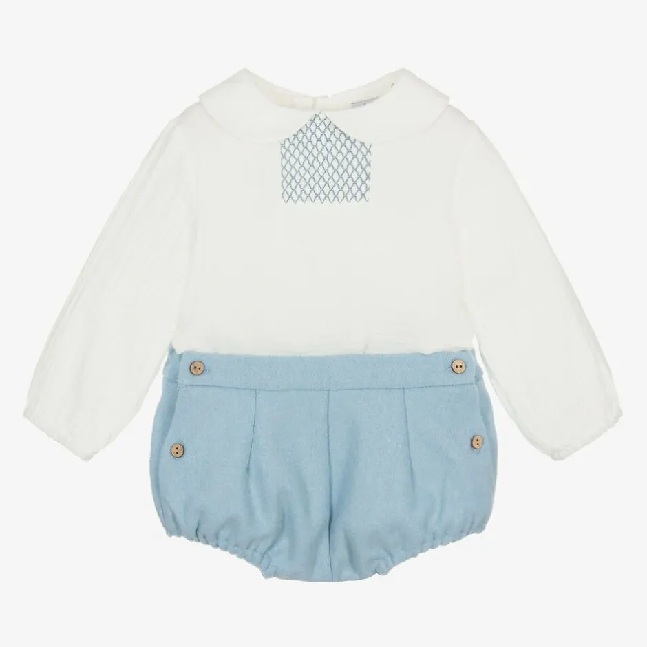 In white and pale blue, this traditional shorts set for little boys is by Babidu. The bubble shorts are made in a soft wool-feel fabric, with wooden buttons to secure at the sides. They are gently elasticated at the back and around the leg openings. The cotton cheesecloth shirt has a rounded collar and classic smocking detail on the chest, with elasticated cuffs and back button fastenings.