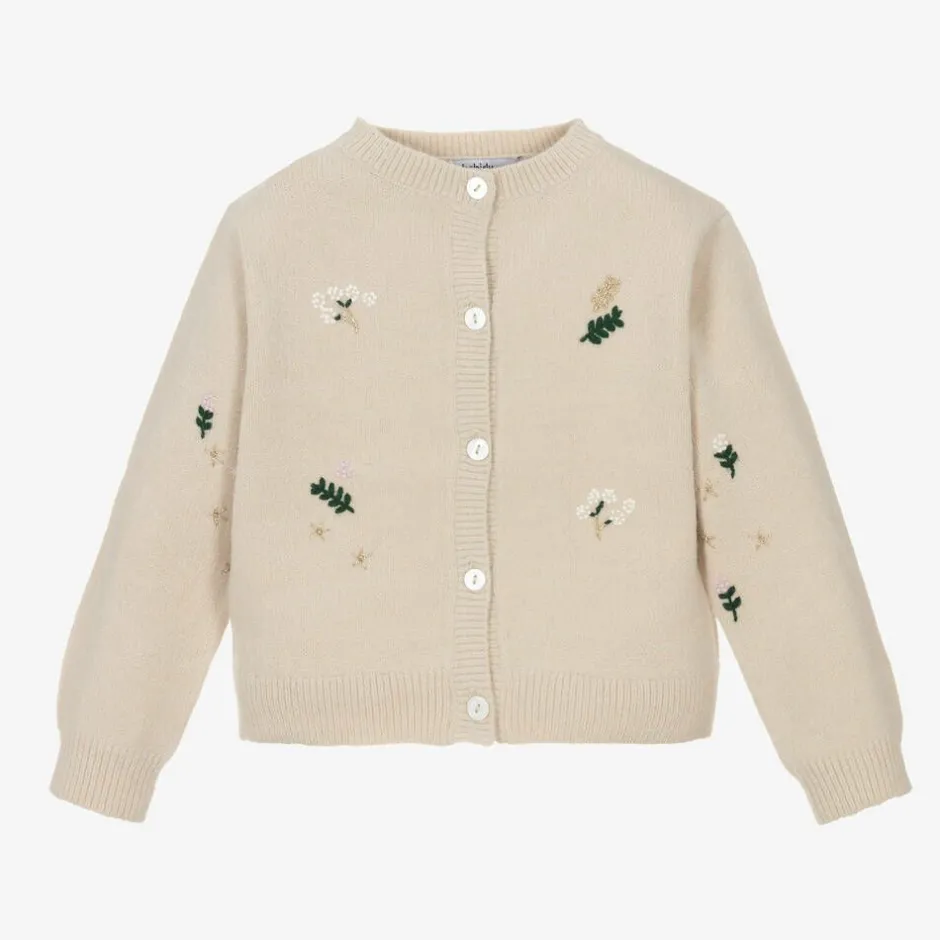 Beige cardigan for girls by Babidu, with beautiful floral embroidery in white, green and sparkly gold. Made in a beautifully soft knit with a touch of wool, it has long sleeves, ribbed trims and fastens with pearlised white buttons on the front.