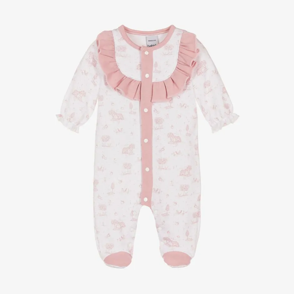 White babygrow for girls by Spanish brand Babidu, made in soft cotton jersey. Comfortable against delicate skin, it has a delightful pink farmhouse and orchard print, with dusky pink trims and ruffles. It fastens with poppers on the front and between the legs.