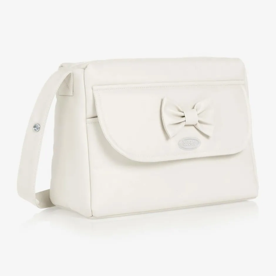 Ivory baby changing bag by Babidu, made from very soft and lightly padded faux leather. Lined in a lightweight polycotton, the main compartment has useful pockets and elasticated bottle holders. The exterior flap pocket has a pretty bow and logo branding. The strap has popper fastenings so it can be attached the buggy handles.
