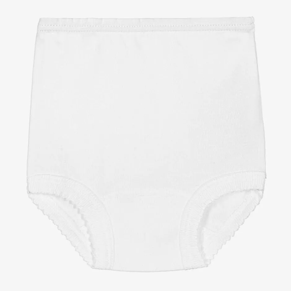 Baby girls white frilly knickers from Babidu. Made in super soft cotton jersey, they have an elasticated high-waist and a sweet lace frill on the back.