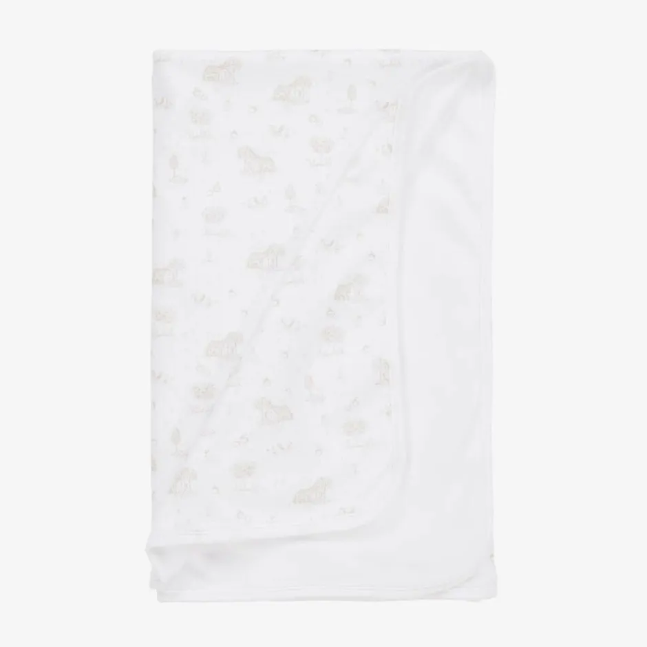 A lovely white blanket for baby boys and girls by Spanish brand Babidu, made in cotton jersey for softness against delicate skin. Providing an extra layer of warmth, this machine-washable accessory is patterned in a light beige farmhouse and orchard print. It is great for keeping little ones comforted at home or out and about in the stroller.