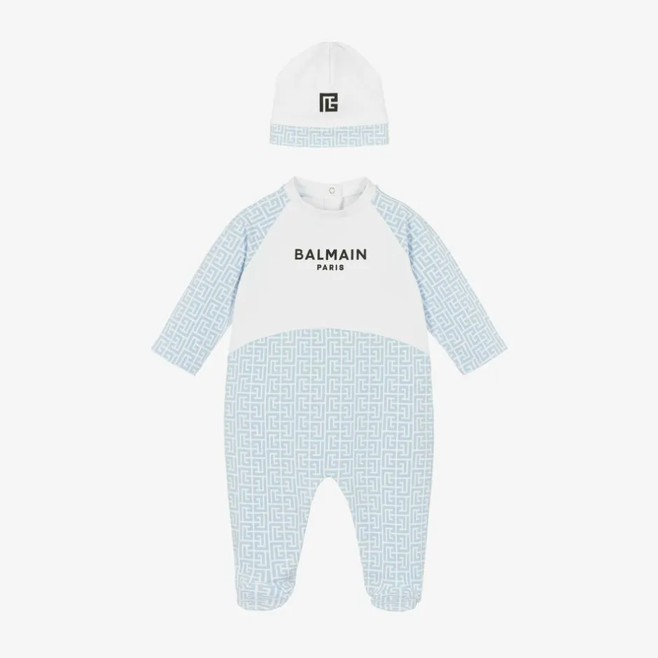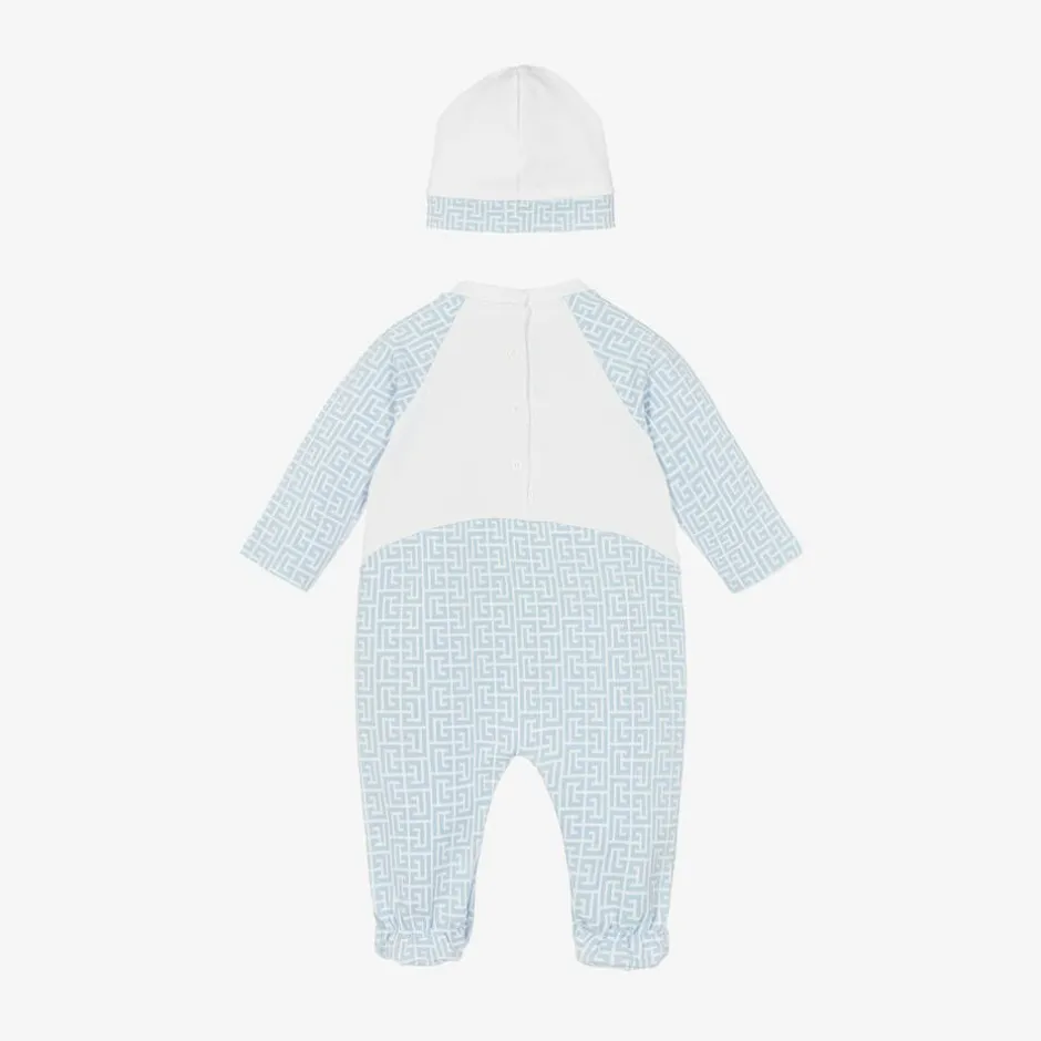 Stylish white and pale blue cotton babygrow gift set for boys by luxury French designer Balmain, made in soft, comfortable jersey. The babygrow has a bold black, rubberised logo on the bodice and is patterned with the unmistakable Balmain monogram logo in pale blue. It fastens with poppers on the back and between the legs. The coordinating, double-layered hat has a rubberised black monogram logo on the front and a pink monogram-patterned brim.