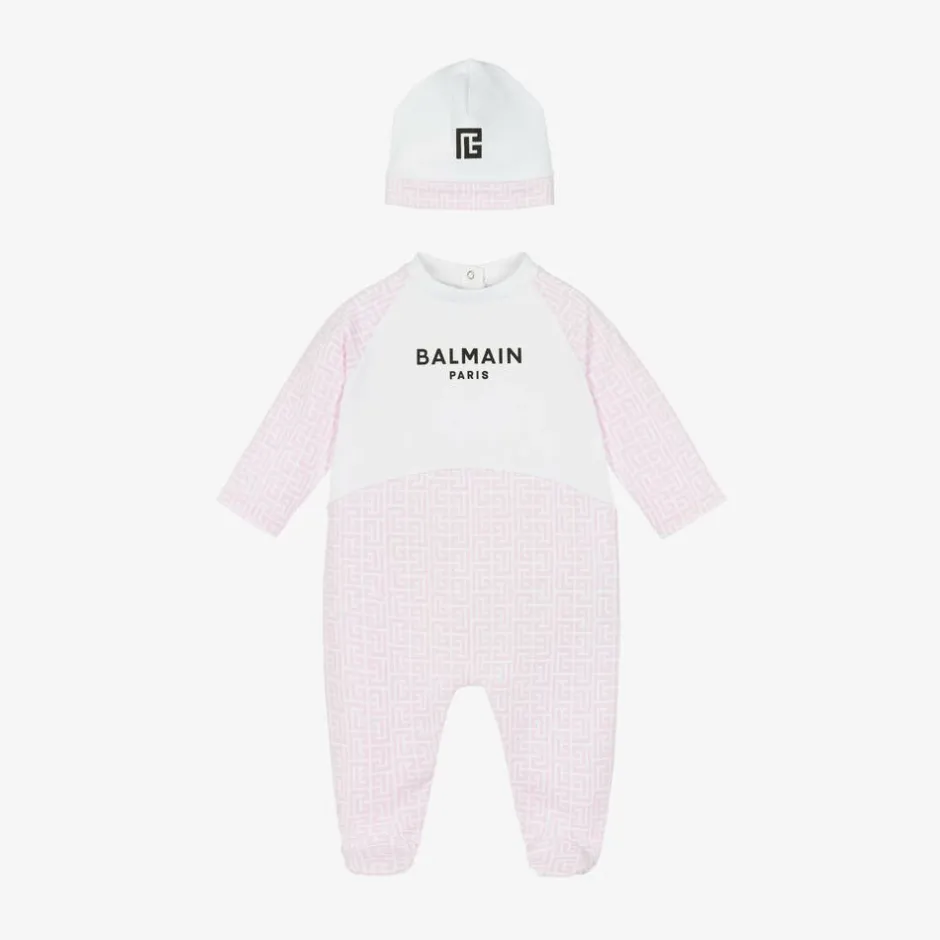 Stylish white and pale pink cotton babygrow gift set for girls by luxury French designer Balmain, made in soft, comfortable jersey. The babygrow has a bold black, rubberised logo on the bodice and is patterned with the unmistakable Balmain monogram logo in pale pink. It fastens with poppers on the back and between the legs. The coordinating, double-layered hat has a rubberised black monogram logo on the front and a pink monogram-patterned brim.