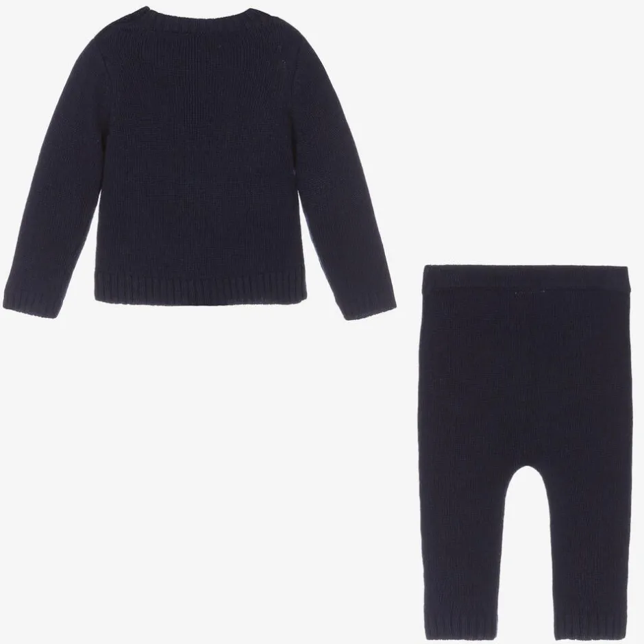 Baby boys navy blue two-piece trouser set by British heritage brand Beatrice & George. Exclusive to Childrensalon, the outfit is knitted in a soft cashmere and Merino wool blend, with cos ribbed trims. The sweater has a red intarsia train across the front and useful button fastenings on one shoulder. The coordinating trousers have a gently elasticated waistband, just right for little tummies.