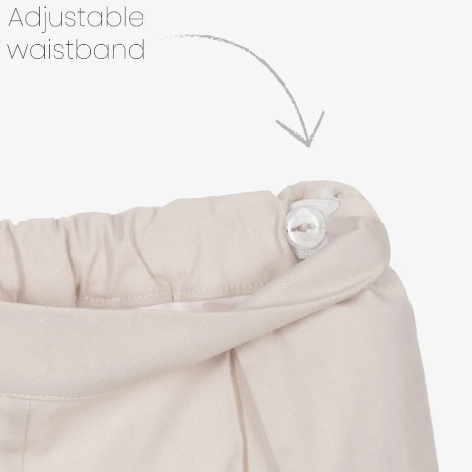 Smart-casual beige cotton shorts for boys by classic British designer Beatrice & George, exclusive to Childrensalon. Ideal for warmer days, they are made in lightweight twill with inverted pleat detailing on the front. Lined in voile for comfort, they have a semi-elasticated waistband with an adjustable waistband for a great fit.
