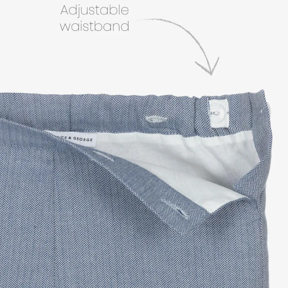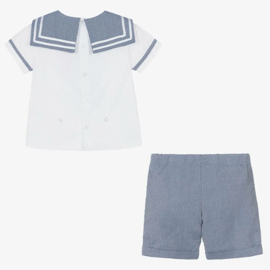 Exclusive to Childrensalon, a traditional white and blue shorts set for younger boys by British heritage brand Beatrice & George. The white shirt is made in luxuriously soft cotton, with a blue sailor collar trimmed in white grosgrain ribbon. The soft cotton-blend, blue herringbone shorts have cute turned-up cuffs, a useful adjustable waistband for a good fit and a comfortable cotton lining. The shirt buttons onto the shorts, keeping boys neat and tidy.