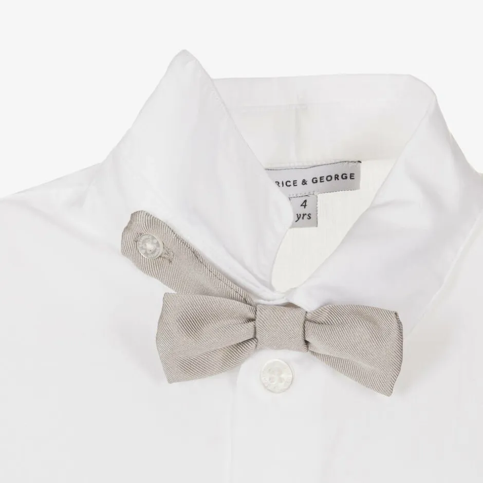 Exclusive to Childrensalon, a gorgeous special occasion suit for boys by British heritage brand Beatrice & George. Made in lustrous, soft bronze satin twill, the slightly fitted jacket has useful front pockets, a faux chest pocket and covered button fastenings. For comfort, it is lined in cotton and styled with a back vent for ease of movement. The matching trousers have slanted front pockets, an adjustable waistband for an ideal fit and a partial satin lining. A white cotton shirt completes the look, with a button-fastening, satin bow tie for a smart finish.