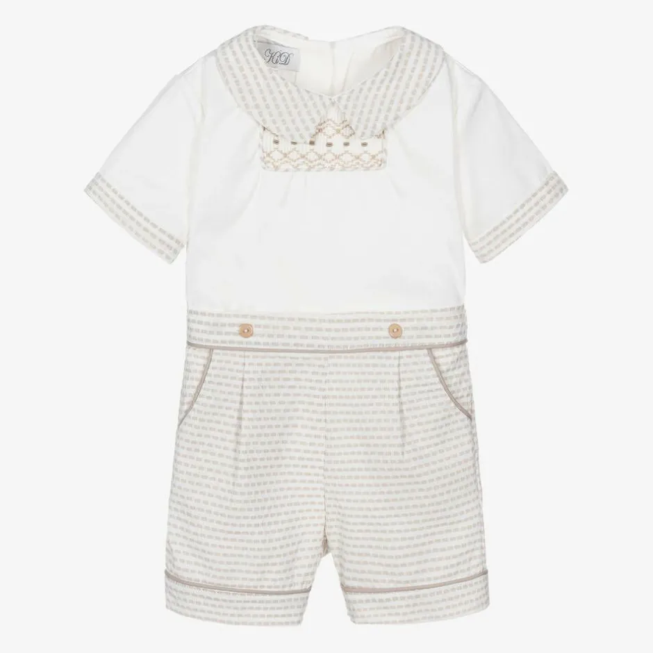 A traditional ivory and beige buster suit for baby boys by Beau KiD, made in soft cotton. Designed with a basket weave effect, the shorts have side pockets and a gently elasticated waistband. The shirt has matching trims, a smocked panel on the front and back button fastenings. Both pieces button together for a neat, tucked-in look.