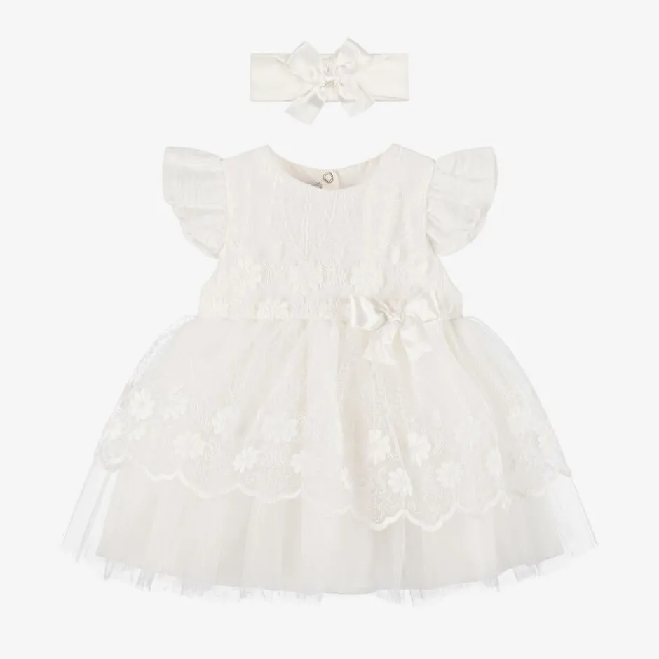 A beautiful ivory special occasion dress for baby girls by Beau KiD. Made from layers of lightweight tulle, it has a floral-embroidered tulle overlayer with scalloped edging for a sweet and delicate look. It has a silky underlayer and a smooth woven cotton-blended lining for extra comfort. Fastening with poppers, there is an appliqué satin ribbon bow on the front, frilled short sleeves, and a detachable bow brooch that can be secured with a safety pin on the back for a delightful finish. A coordinating headband completes this elegant style.