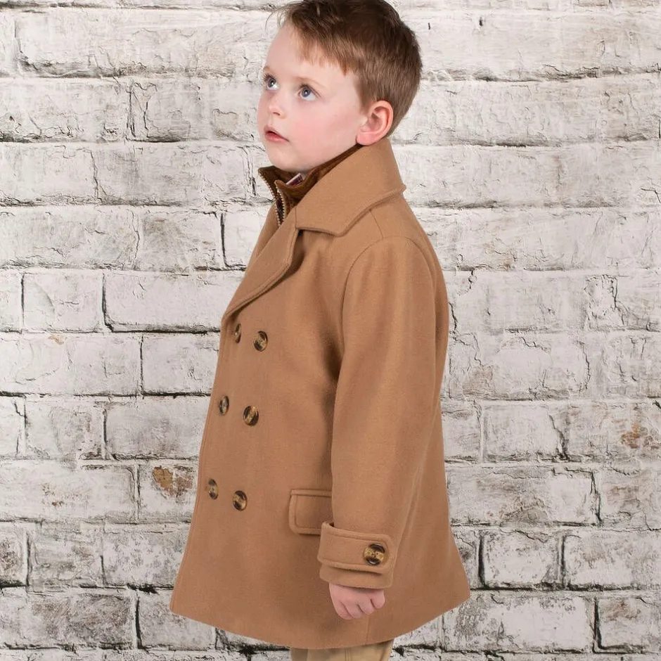 Dark beige coat and cap set for boys by Beau KiD. Super soft and comfortable to wear, it has a smart collar and double-breasted button closures on the front for a timeless silhouette. To lock in warmth, it has an interior zip fastening with super soft velour trims for extra comfort. There are useful front flap pockets and classic button detailing on the cuffs. It comes with a matching flat cap with a small stiff brim in the front to complete a traditional look.
