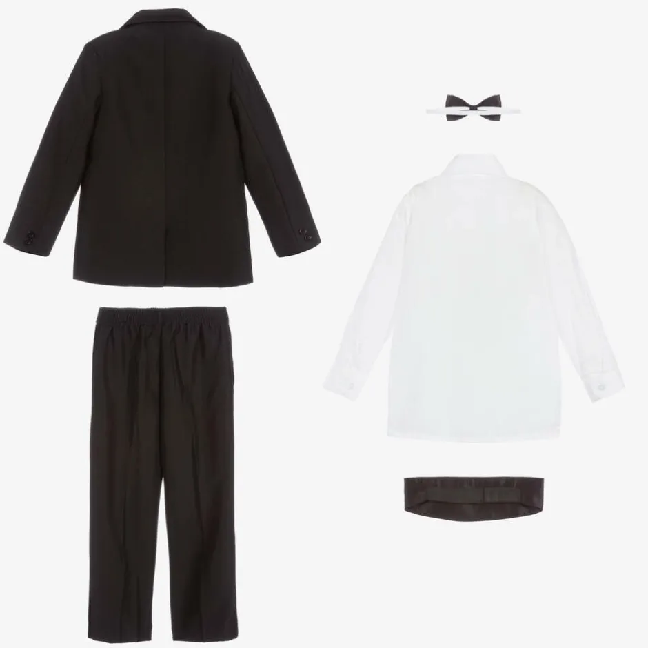 Boys black, special occasion, five-piece tuxedo by Beau KiD. The jacket and trousers have a satin trim, matching the cummerbund and bow tie. The white polycotton shirt has pin tucks on the front and two sets of button fastenings. The black buttons can be removed and the white buttons used.