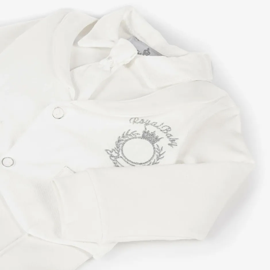 Ivory babysuit set for boys by Beau KiD, made in soft cotton jersey. Ideal for those smarter occasions, the collared babygrow has an attached tie and waistcoat, with faux pocket detailing and button fastenings. It has poppers down the front and between the legs for easy dressing. The sweet look is completed with a matching hat, styled with a soft peak and a useful bib, with a popper to secure at the back of the neck. All pieces are embroidered with a Royal Baby crest in silver thread for added sparkle.