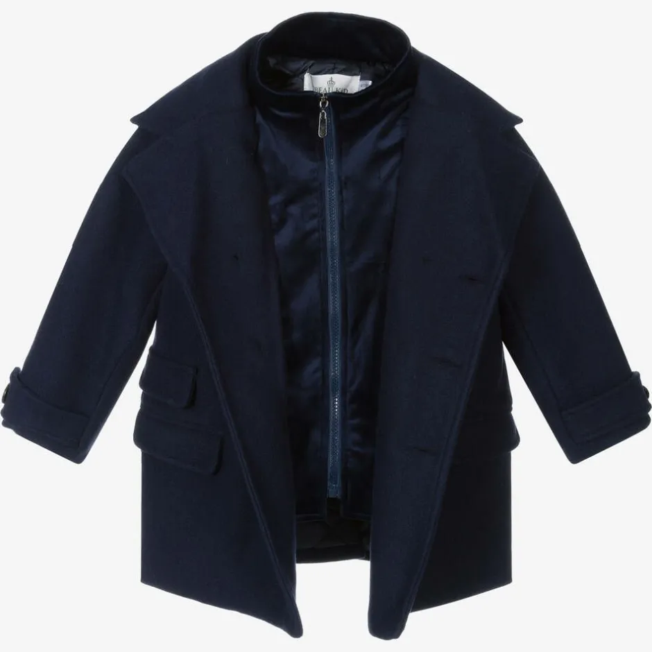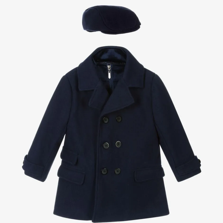 Navy blue coat and cap set for boys by Beau KiD. Super soft and comfortable to wear, it has a smart collar and double-breasted button closures on the front for a timeless silhouette. To lock in warmth, it has an interior zip fastening with super soft velour trims for extra comfort. There are useful front flap pockets and classic button detailing on the cuffs. It comes with a matching flat cap with a small stiff brim in the front to complete a traditional look.
