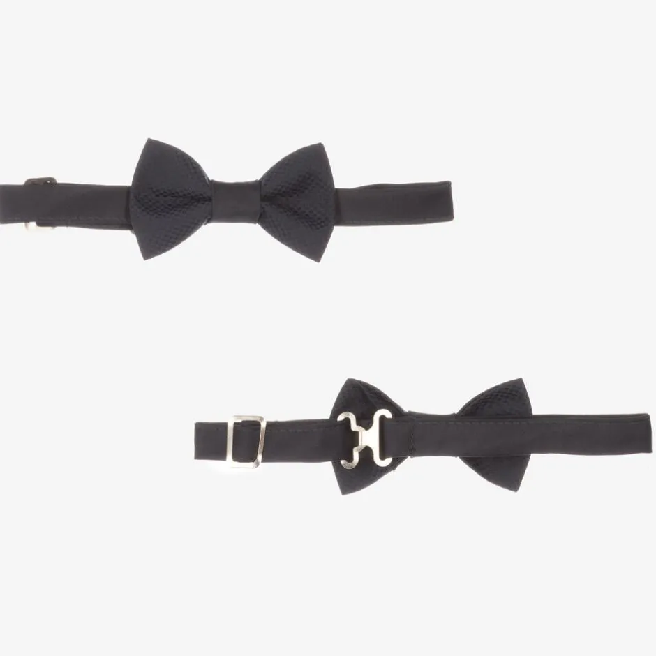 Smart navy blue tuxedo suit for boys by Beau KiD, comprising a suit, bow tie, pocket square and shirt. The navy blue honeycomb satin blazer has silky lapels and a black gemstone button fastenings. The white dress shirt has a winged collar for a classic look. The navy blue satin trousers have an adjustable waist, ensuring a good fit. The set is completed by a matching, adjustable bow tie.