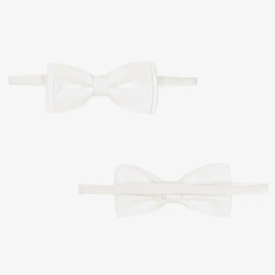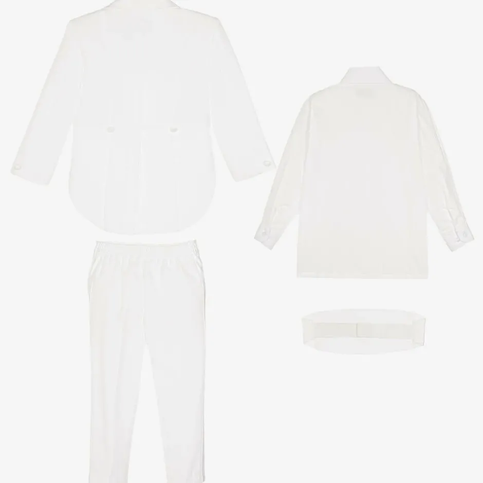 Boys white tuxedo suit by Beau KiD. The tail jacket and trousers are made in a lightweight twill, with satin trim to match the cummerbund and bow tie. The jacket is designed not to fasten and the trousers have an elasticated waist. It comes with a white cotton blend dress shirt. The fit can be quite big, so we recommend you check measurements before ordering.
