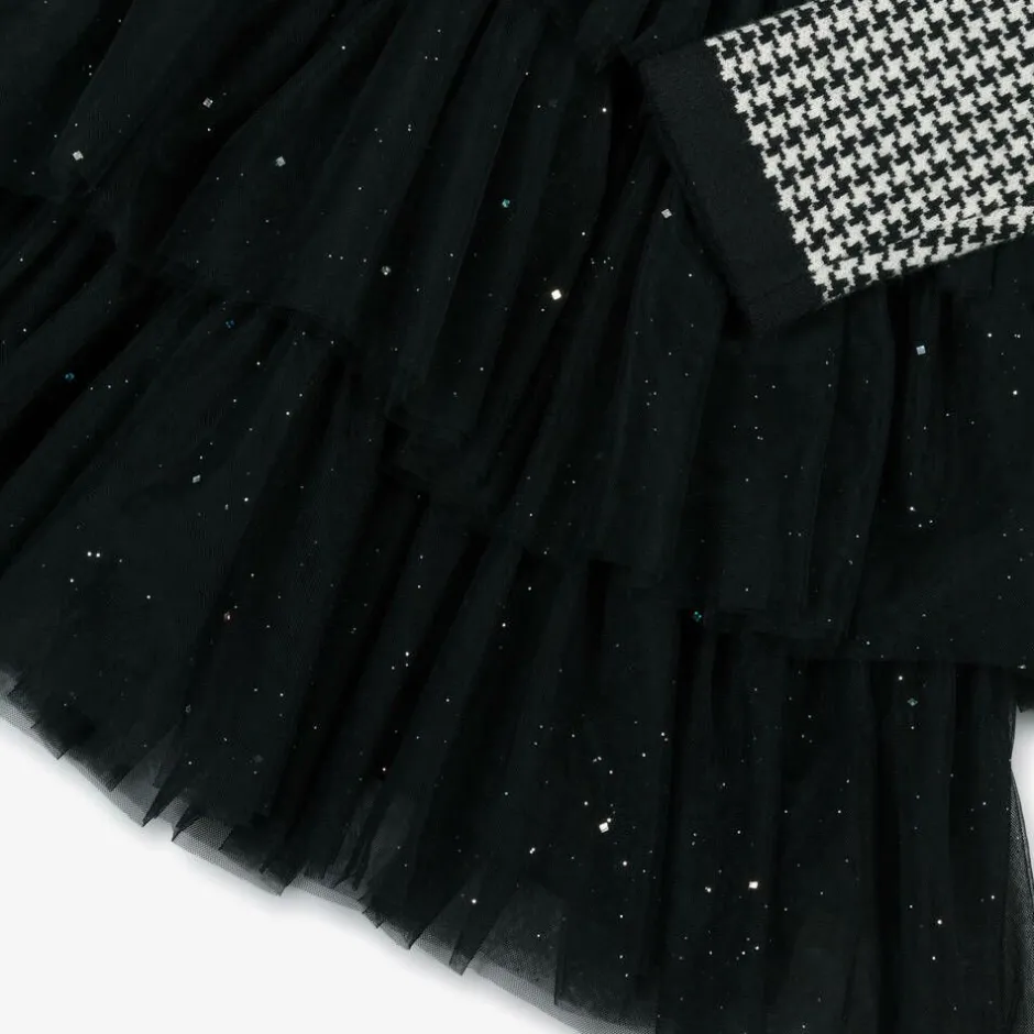 A black knitted dress for girls by Beau KiD, stylish and fun for a party look. Knitted in a soft viscose blend for comfort, the top has a timeless white houndstooth pattern whilst the skirt has a tulle overlay with glitter for added sparkle.