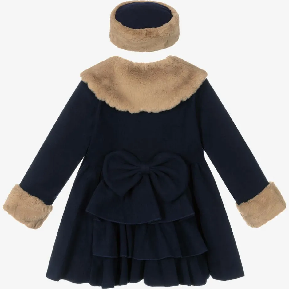 A navy blue coat and hat set for girls by Beau KiD, made in a lovely soft, felted fabric. Designed with an oversized faux fur collar, it has matching beige trims on the cuffs, decorative branded buttons on the front, and a traditionally styled gathered waist. A large bow can be seen on the back, together with pretty tiered layers. Fully lined, the coat has useful side seam pockets and concealed popper closures on the front. It comes with a matching pillbox-style hat for a complete and coordinated look.