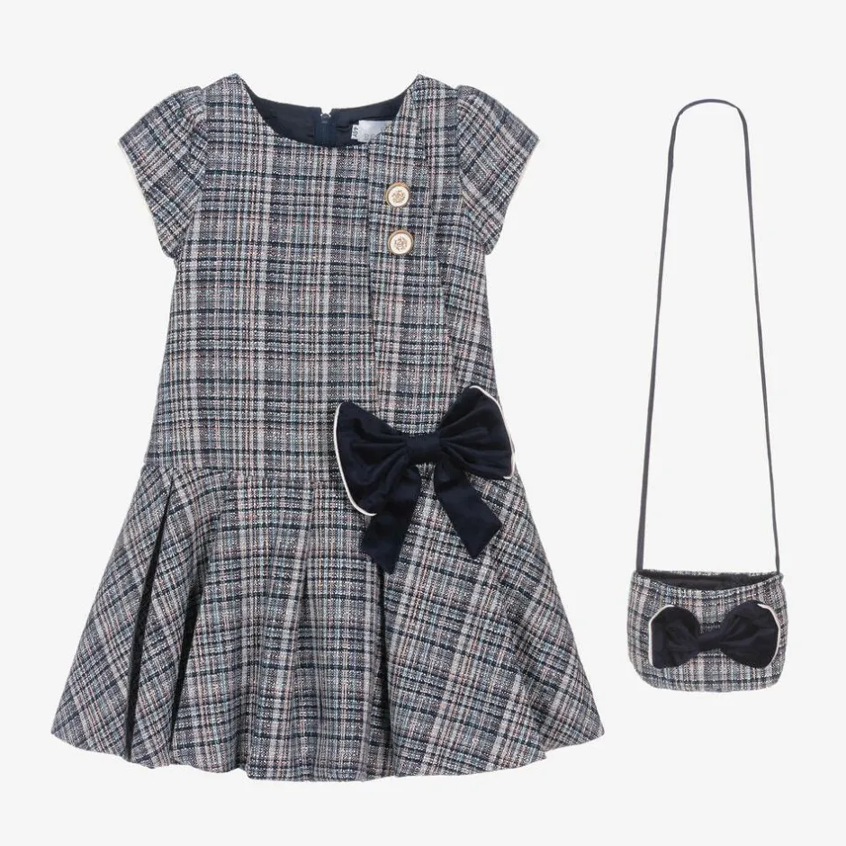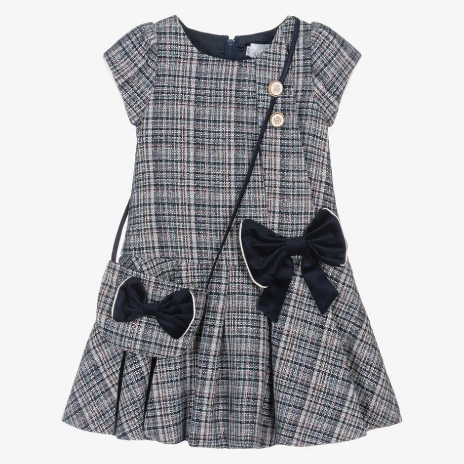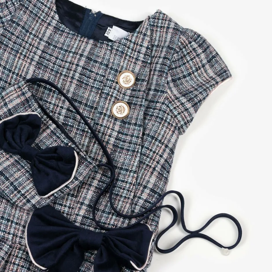 Smart tweed dress for girls by British brand Beau Kid, in shades of blue and dusky pink. Made in a soft cotton and viscose blend, it has a panel running down one side, with decorative white and gold crest buttons and a fixed velvet bow on the dropped waist. The skirt has box pleating all around and there is a navy blue satin lining for comfort. The dress fastens with a zip around the back and comes with a matching shoulder bag with a satin strap and small interior compartment.