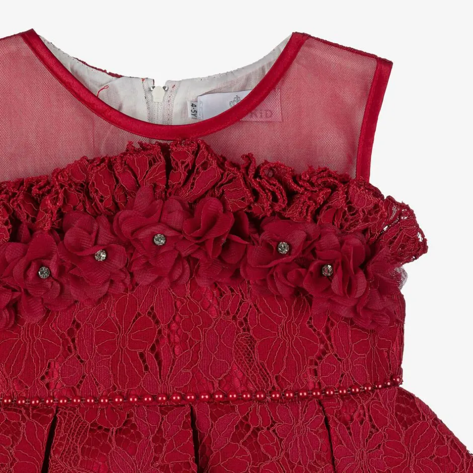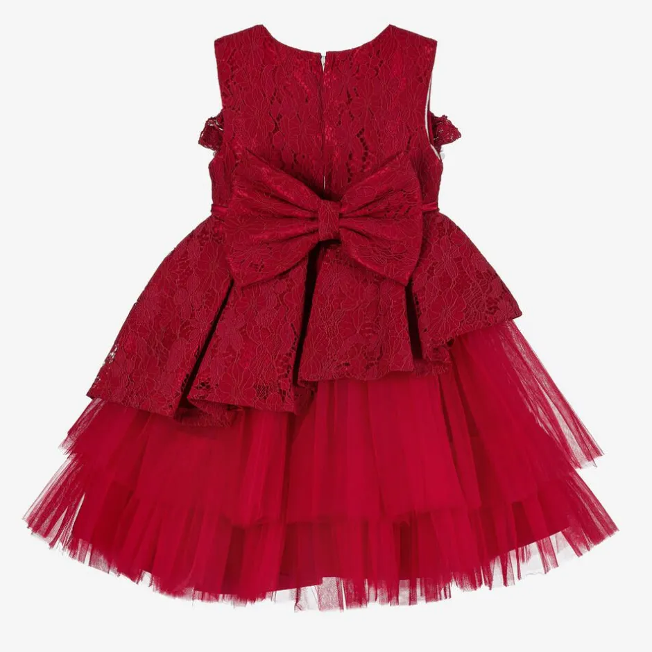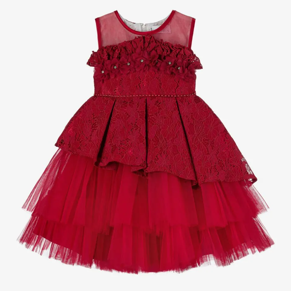 Girls will be able to party in style in this red special occasion dress by British brand Beau Kid. With sheer, ribbon-trimmed mesh on the front of the shoulders, the bodice is made in beautiful lace, with a ruffle across the chest and georgette flower appliqués below, sparkling with diamanté centres. The waist is defined by pretty pearl beads, below which is a tier of asymmetric box pleats with dramatic tiers of tulle below. Fully lined in satin for comfort, there is a zip fastening on the back, a large detachable bow secured with buttons and a fixed ribbon sash.