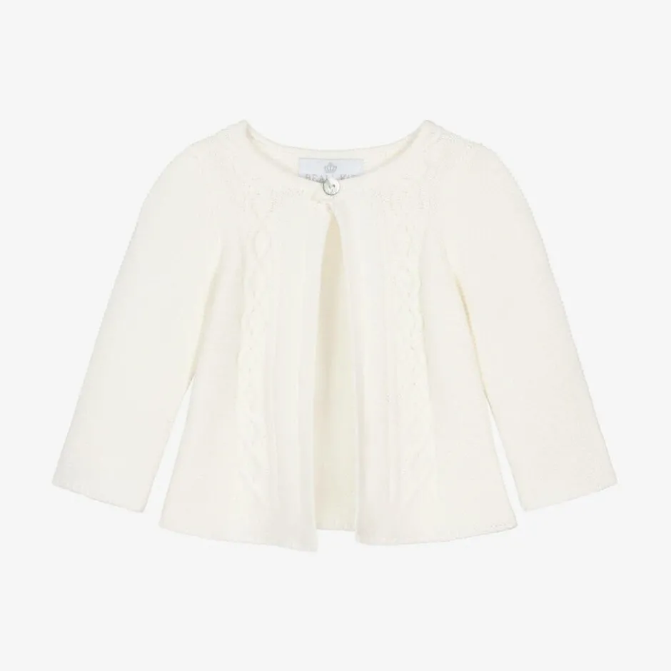 Ivory cardigan for baby boys and girls by Beau KiD, knitted in soft cotton. Ideal for layering, it has a lovely cable pattern on the front and fastens with a single mother-of-pearl button on the front.