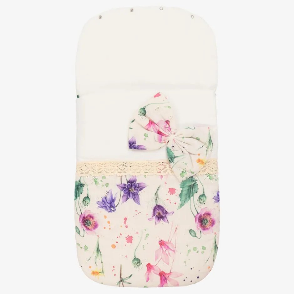 Lovely padded ivory nest for baby girls by Beau KiD, patterned with pink, purple and green flowers. Soft and lightweight with a jersey upper part, it has a large fixed bow and a band of beige lace across the middle. As baby grows, the popper fastenings on the hood can be opened out to create a flat surface.