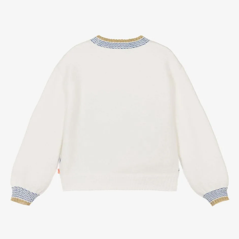 A fun ivory sweater for girls by Billieblush, in a super soft and cosy knit. It is patterned with glittery blue hearts and the brand's sparkly gold logo on the front, with coordinating trims around the ribbed neckline and cuffs.