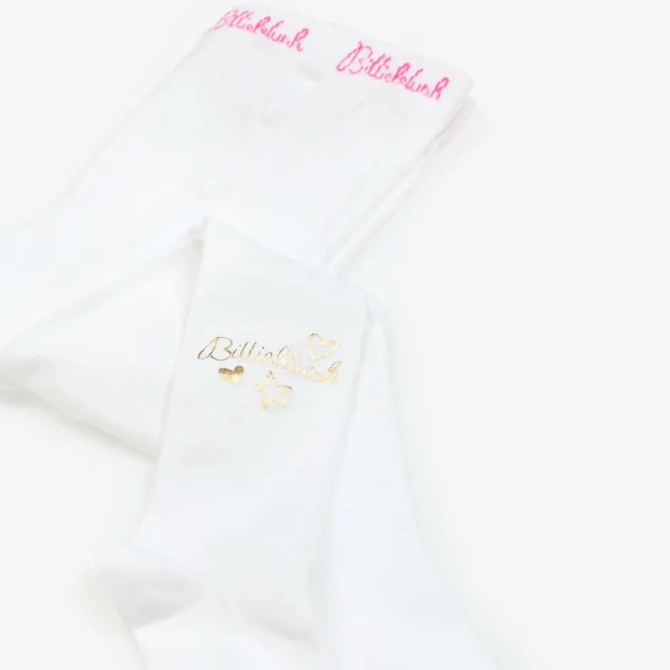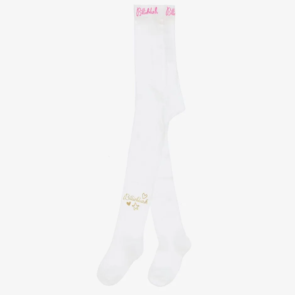 Ivory tights for girls by Billieblush, with metallic gold logo and motifs on the side. Easy to wear, they are soft and stretchy with the brand name repeated in pink on the waistband.