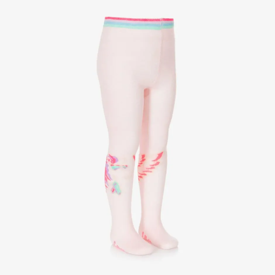 Sparkly pale pink tights for girls by Billieblush, with a fun and colourful Pegasus design on each leg. They are made in a soft and stretchy cotton blend, with multicolour stripes around the elasticated waist. Adding a signature finish, the designer's neon pink logo is visible on the sole.