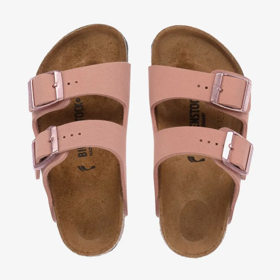 Lovely dusky pink sandals for girls by Birkenstock, made in the brand's signature, soft Birko-Flor faux leather. They have supportive straps across each foot, accented with metallic pink buckle fastenings. The moulded insole is made in soft suede leather for comfort, and is set on a natural cork footbed for a classic Birkenstock look. They have a contrasting black outer sole, made in soft, non-slip rubber with ridges for improved grip.