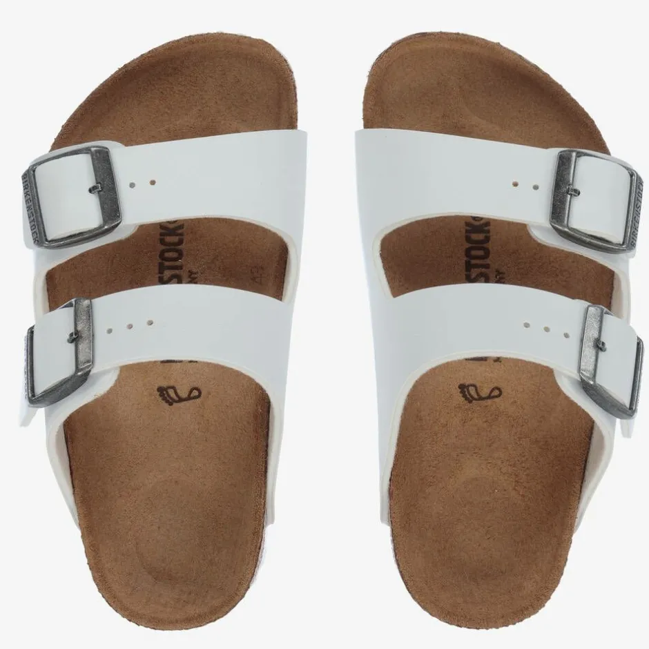 White sandals for boys and girls by Birkenstock, with silver buckle fastening on the Birko-FlorĀ® faux leather straps. German-made, these sandals have a unique contoured footbed that promotes good walking posture, making them a great choice for growing feet. For added comfort, the straps have a soft fleecy lining.
