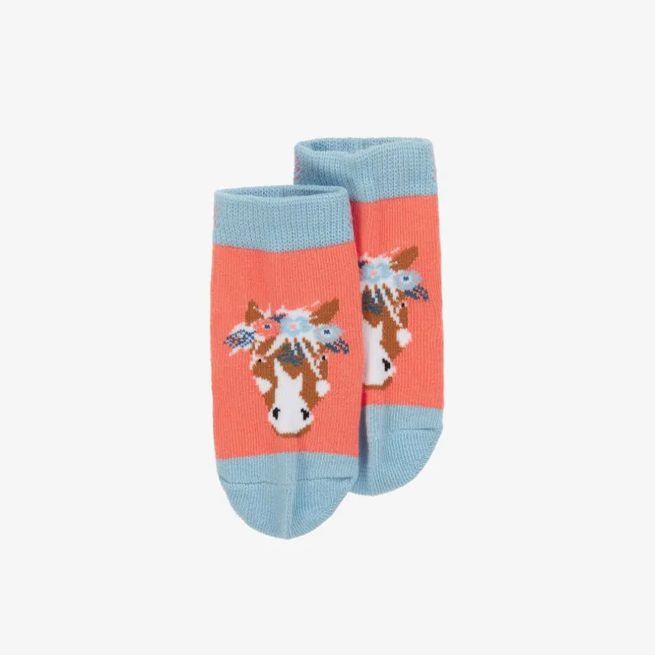 In a lovely shade of pink, these sweet socks for girls by Blade & Rose, feature a cute print of Bella the Horse on the front. They are made in a soft and stretchy cotton blend knit, with blue trims on the heel, toe and cuffs.