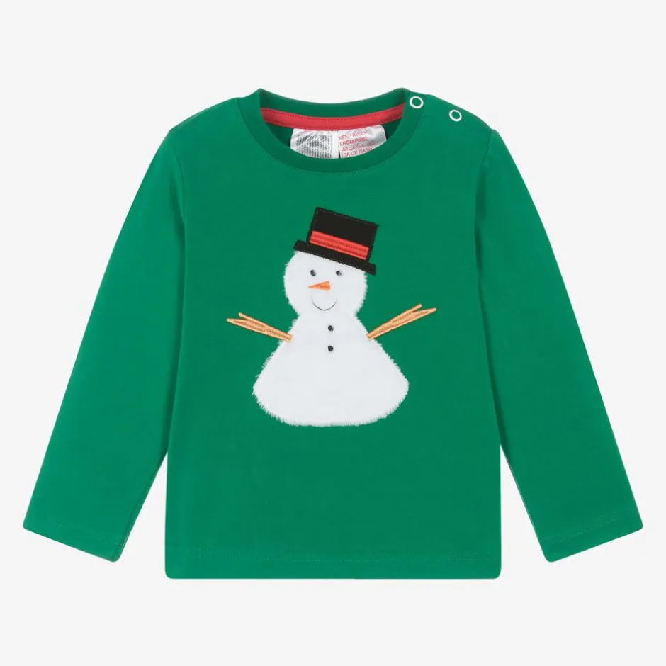 Green long-sleeved top for little boys and girls from Blade & Rose, made in soft and comfortable cotton jersey. Lovely for the festive season, it has a fluffy snowman appliqué with an embroidered happy face. Popper fastenings on one shoulder help with dressing and a logo print on the back completes the look.