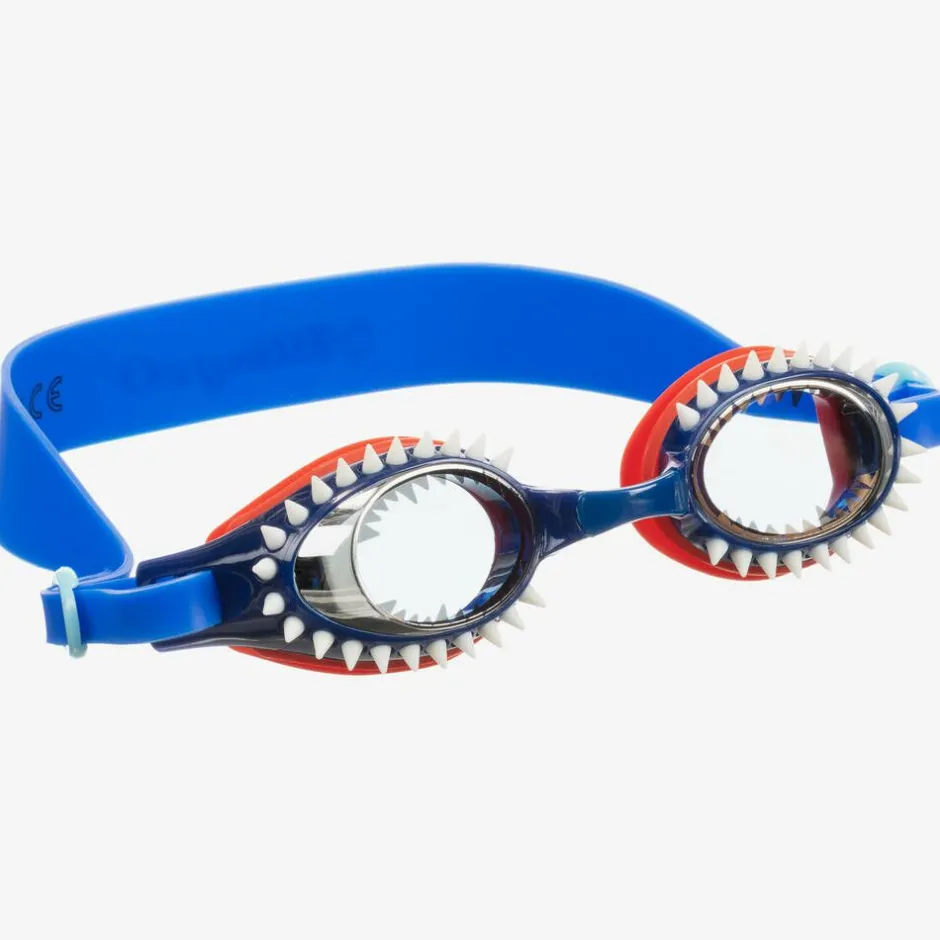 Blue and red swimming goggles for boys by Bling2o, with white 3-D shark teeth around the frames. They are latex free, anti-fog and give 100% UV protection. The goggles have an adjustable strap and come in a hard protective case. To ensure a perfect fit, they come with three sizes of detachable nose bridges.