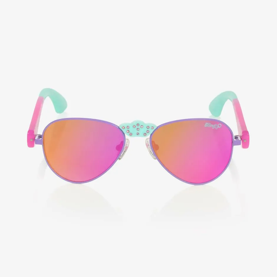 Pastel-coloured aviator sunglasses for girls by Bling2o, in lilac purple, pink and green. Made in stainless steel and lightweight acrylic, they are designed with fun mermaid details on the frame and pink diamanté on the bridge. The dark-tinted, mirrored lenses offer maximum UVA and UVB protection. A branded storage pouch is included to protect the lenses.