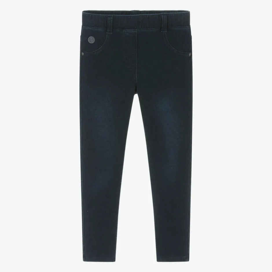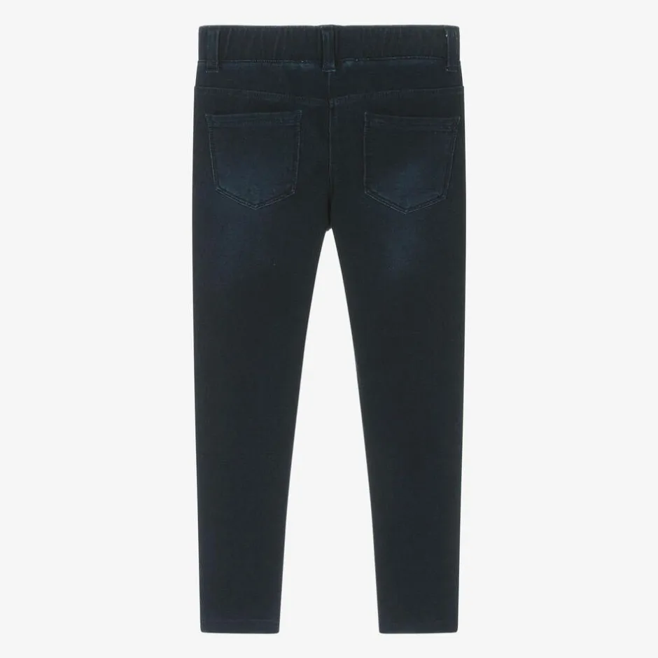 Casual dark indigo blue denim look jeggings for girls by Spanish brand Boboli. made in a soft and stretchy cotton blend jersey. They have belt loops, faux pockets with silver rivets and an embossed logo tab on the front. There are two patch pockets on the back and an elasticated waistband for easy pull-on.