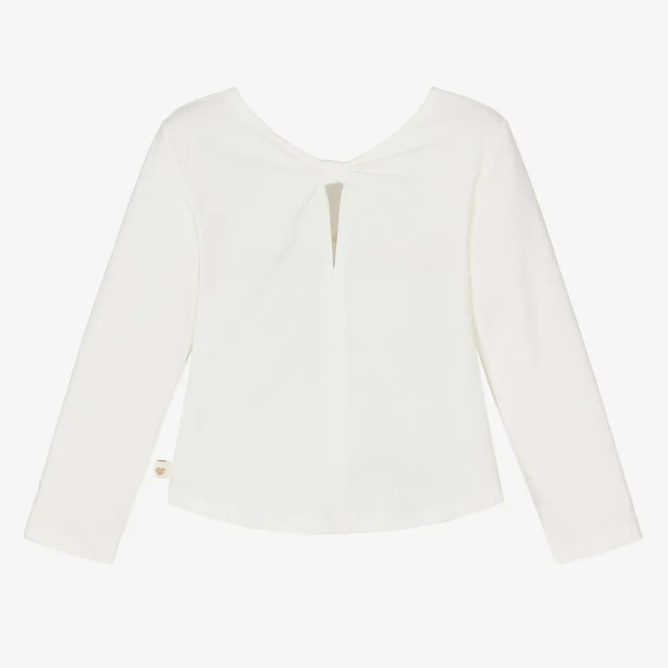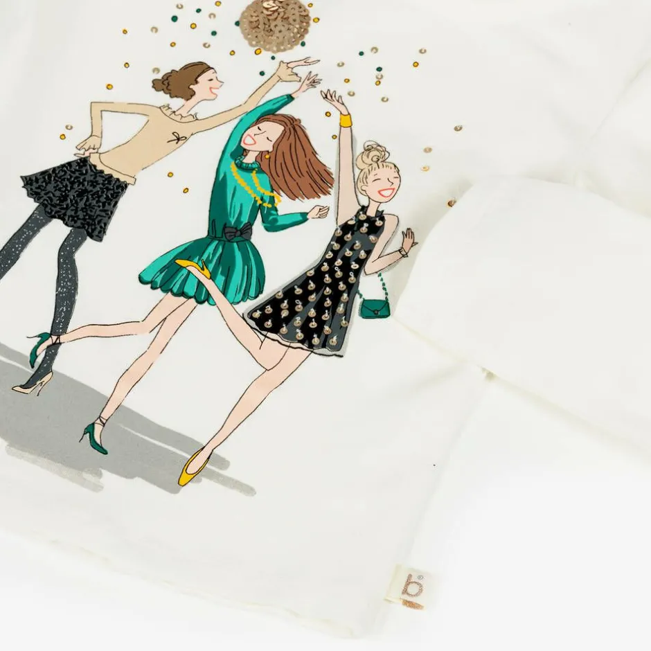 Ivory top for girls by Boboli, made in soft and stretchy cotton jersey. It has long sleeves, a round neckline and a knotted detail on the back. A fun graphic print on the front illustrates three girls dancing under a sequin disco ball in gorgeous party dresses.