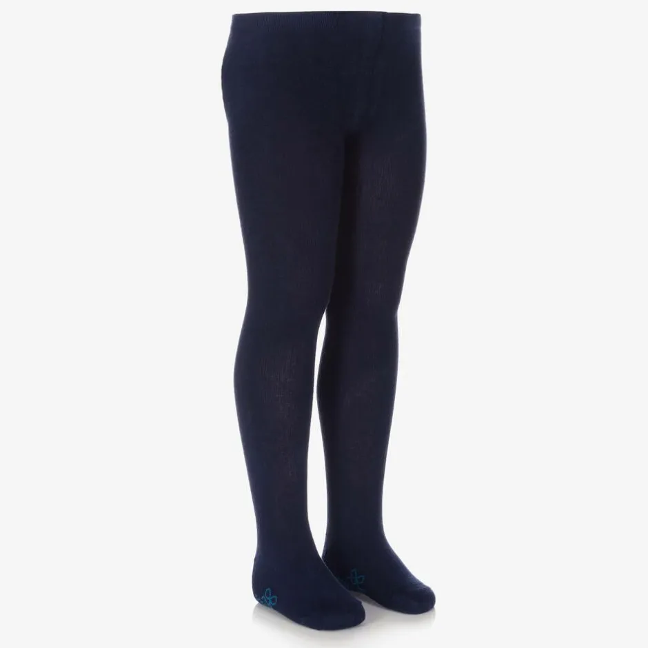 Comfortable navy blue tights for girls by Spanish brand Boboli, made in a soft and stretchy cotton rich blend. These useful essential accessories have the brand's logo on the soles of the feet for a subtle designer touch.