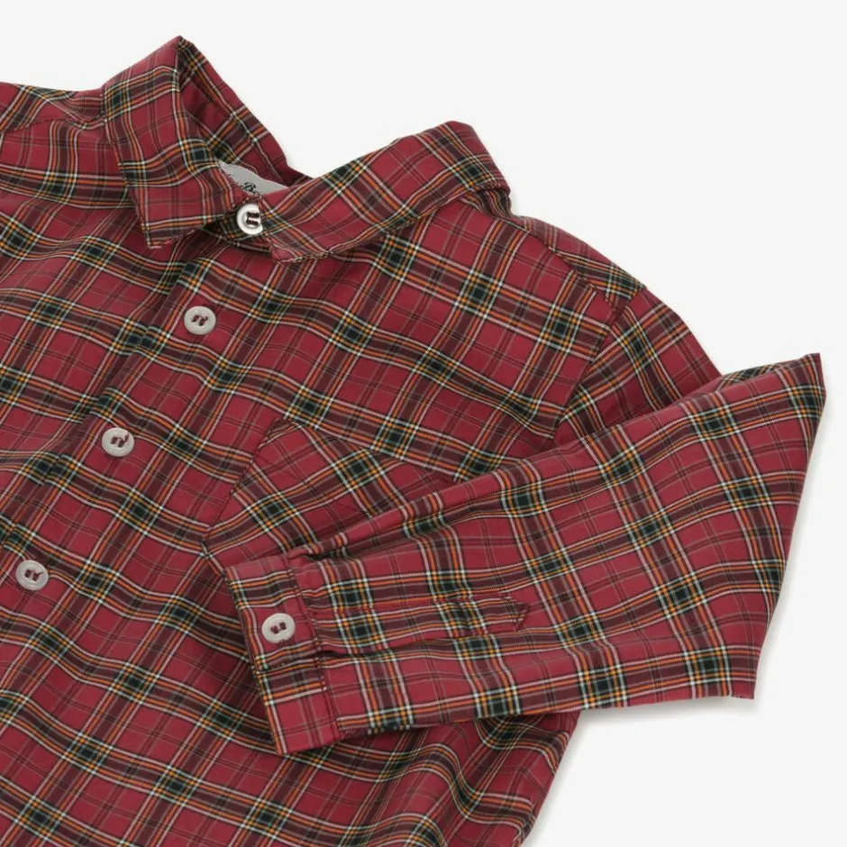 A red checked shirt for little boys by French brand Bonpoint, with crossing lines in orange, white and black. Made in lightweight cotton fabric, this buttoned shirt has a pointed collar for layering under sweaters in cooler weather. It is designed with buttoned cuffs and a small patch pocket on the chest.