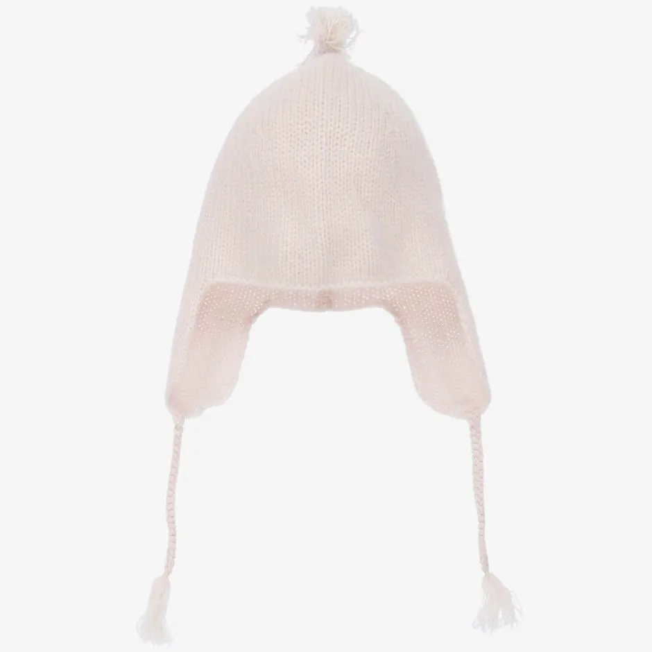 Beautifully soft pale pink hat for little girls by Bonpoint, knitted in luxurious cashmere. It has cosy ear flaps and is secured with braided ties under the chin. Sweet tassels on the ties and on the top of the hat complete the look.