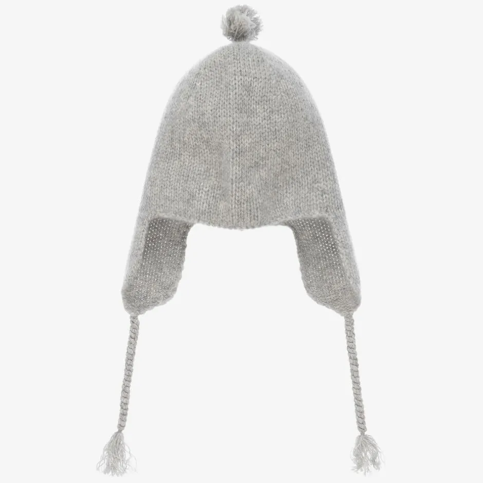 Beautifully soft grey hat for little boys and girls by Bonpoint, knitted in luxurious cashmere. It has cosy ear flaps and is secured with braided ties under the chin. Sweet tassels on the ties and on the top of the hat complete the look.