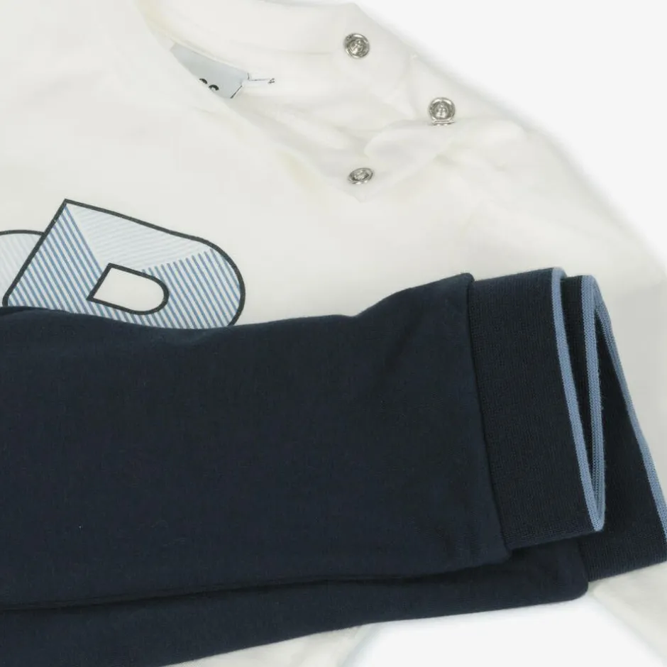 In shades of blue and white, this soft organic cotton jersey tracksuit set for baby boys is by BOSS. The zip-up top has a cosy fixed hood, ribbed trims, and a blue logo print on the chest. The joggers have a comfortable elasticated waist, with a matching logo print on one leg. A white long-sleeved top, with helpful shoulder poppers and the brand's Double B monogram on the front, completes the sporty look. Coming in a branded gift box, the set makes an ideal present for a new arrival.