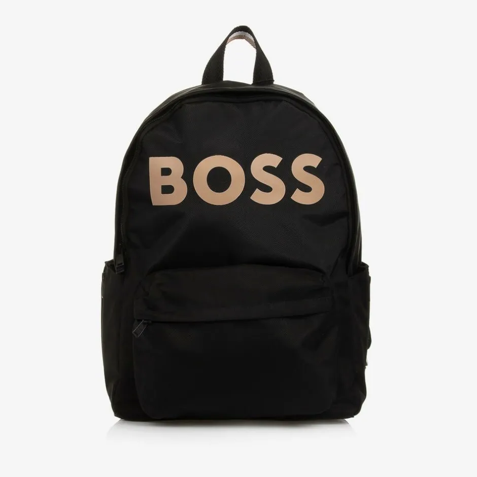 Smart black backpack for boys and girls by BOSS, with a bold beige logo print on the front. Made in silky, durable canvas, it has a spacious main compartment with a padded laptop pocket, and an external front pocket, both secured with zip fastenings. There are useful side pockets with extendable, zipped mesh inserts. The back and adjustable shoulder straps are padded with soft mesh for comfort and there is a convenient carry handle.
