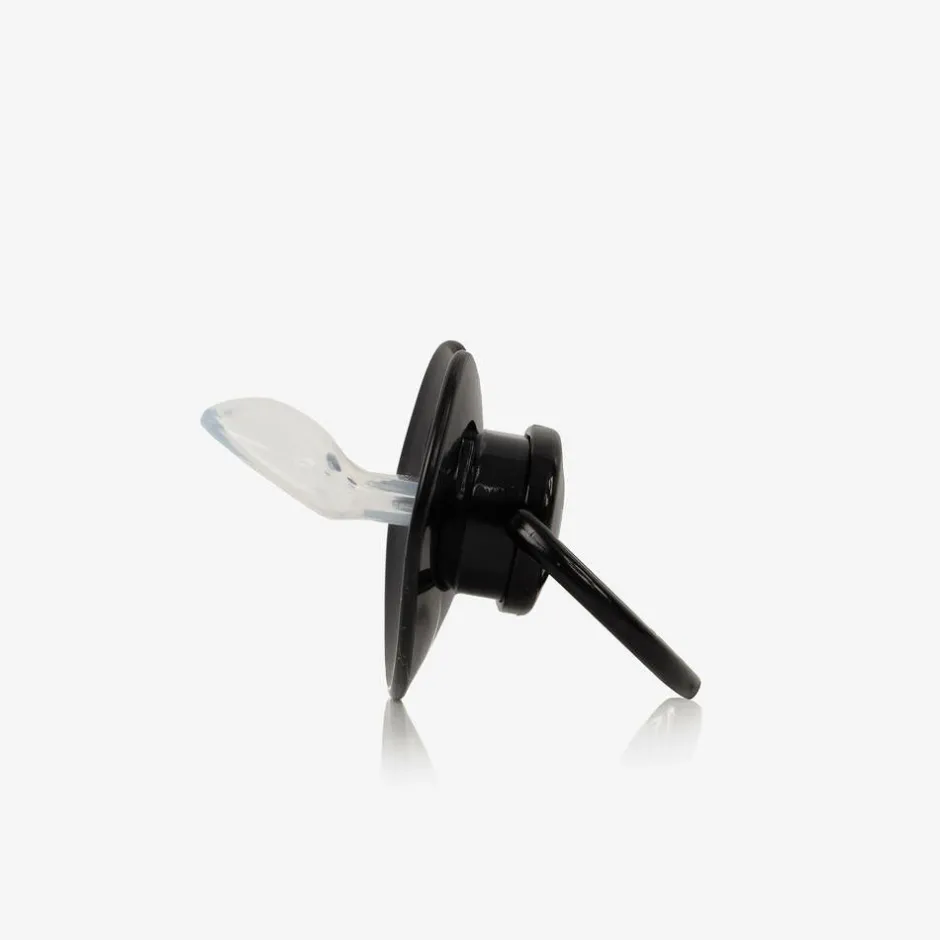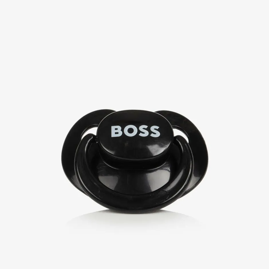 A black BPA-free dummy for baby boys and girls from BOSS, with a white logo print on the front. It has a durable plastic shield with a ring and a silicone teat in a comforting shape. Helping to soothe your little one, the curved top fits easily under the nose and ventilation holes allow air to circulate.