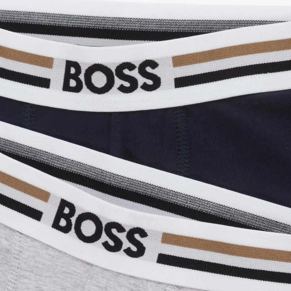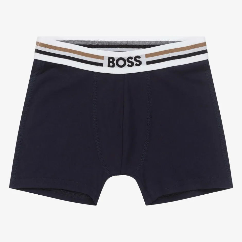 Pack of two, Mini-me boxer shorts for boys by BOSS, in navy blue and grey colourways. Made in soft and stretchy cotton jersey, they have comfortable, elasticated waistbands, woven with the brand's iconic striped trim and logo for a distinctive look.