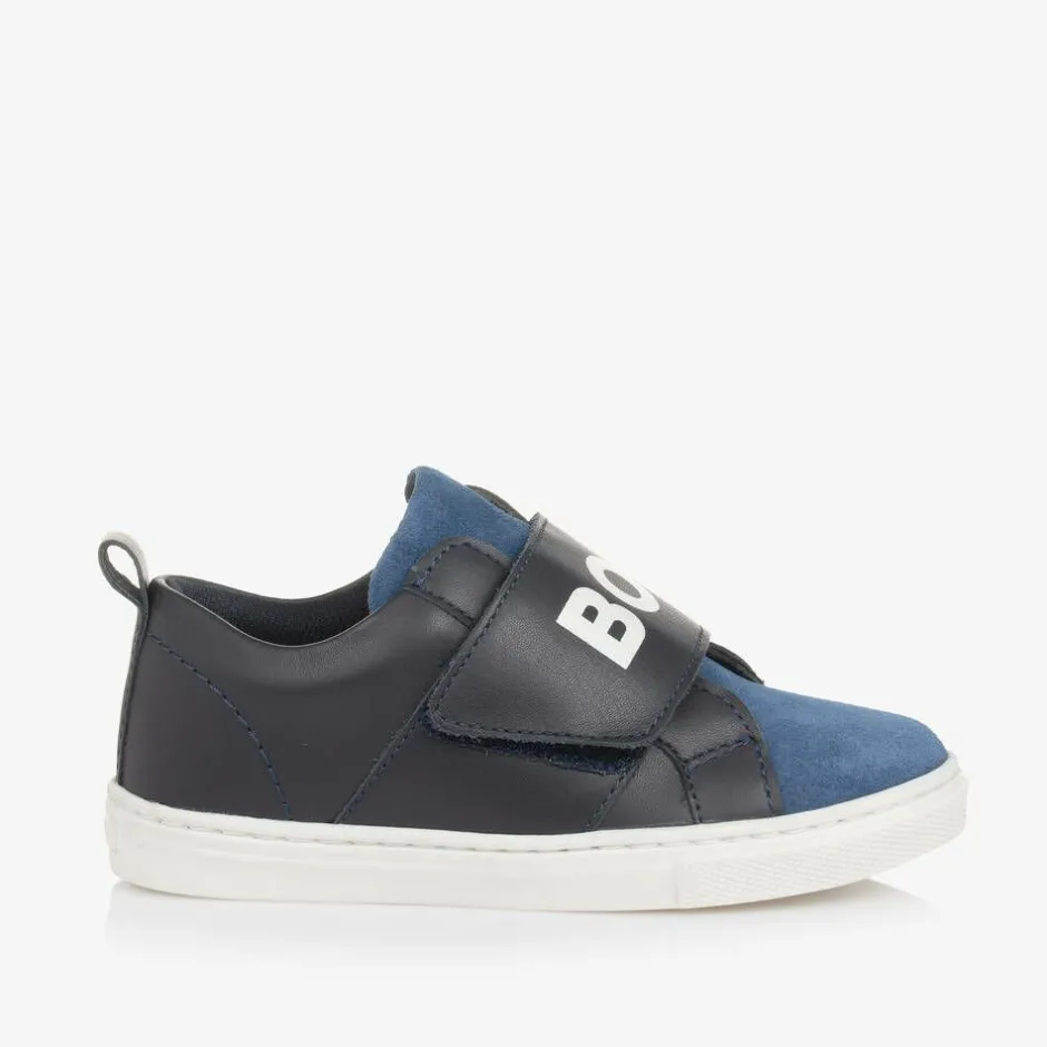 Casual blue trainers for boys by BOSS, made in soft suede and smooth leather for a contrast in texture. These designer trainers have a wide velcro strap across the foot, boldly branded with white logo lettering. They have a soft textile lining and a gently cushioned insole for added comfort. The non-slip rubber outer sole ensures good grip underfoot.