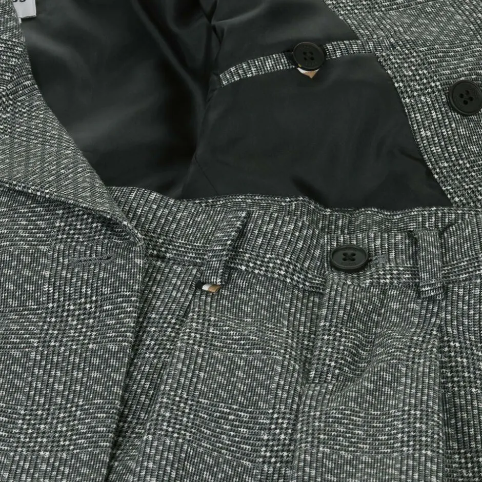 Grey Mini-me suit for boys by BOSS, made in a luxurious viscose blend fabric. Beautifully tailored for a special occasion, it is patterned with a smart Prince of Wales check, overlaid with the brand's Double B monogram logos for an eye-catching designer effect. The double-breasted jacket has faux front pockets, a notch collar and The Original Boss 1977 logo patch on one sleeve. The matching trousers have pleats on the front, slanted pockets and faux pockets on the back. They fasten with a button and zip and have a useful adjustable waist for a great fit.